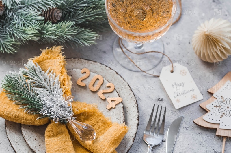 Сервировка стола. Стильные тарелки, салфетка, бокал, шампанское, елочные ветки и рождественские украшения на сером фоне. Концепция счастливого Рождества и Нового 2024 года