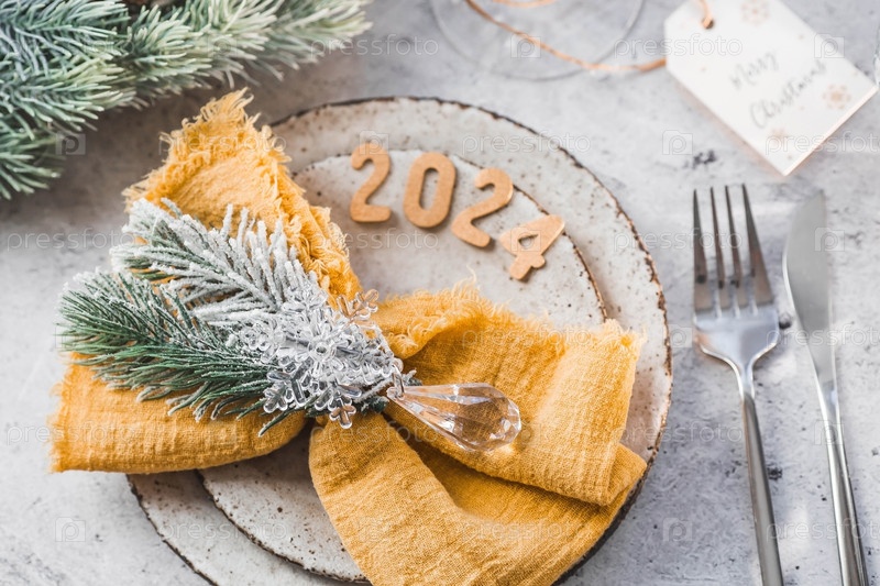 Сервировка стола. Стильные тарелки, салфетка, бокал, шампанское, елочные ветки и рождественские украшения на сером фоне. Концепция счастливого Рождества и Нового 2024 года