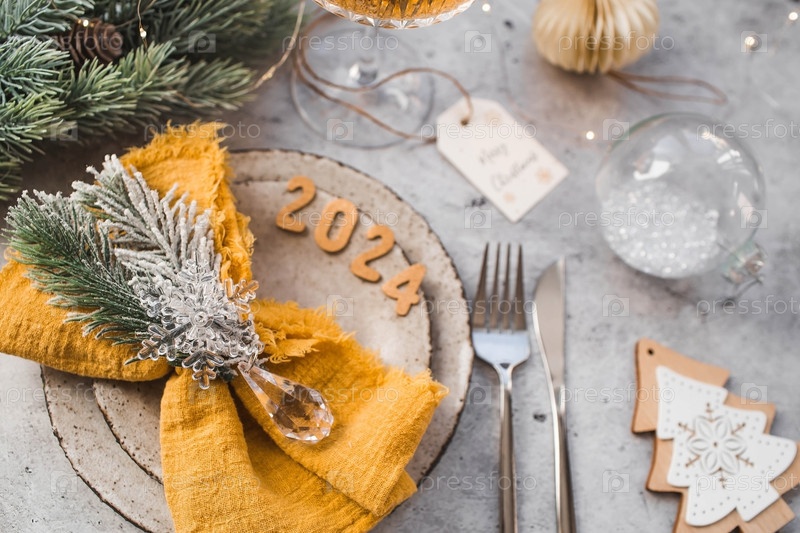 Сервировка стола. Стильные тарелки, салфетка, бокал, шампанское, елочные ветки и рождественские украшения на сером фоне. Концепция счастливого Рождества и Нового 2024 года