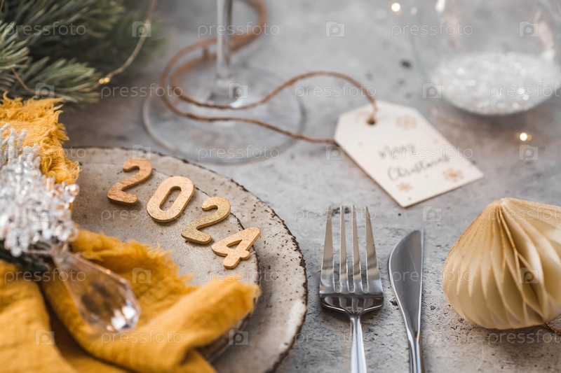 Сервировка стола. Стильные тарелки, салфетка, бокал, шампанское, елочные ветки и рождественские украшения на сером фоне. Концепция счастливого Рождества и Нового 2024 года