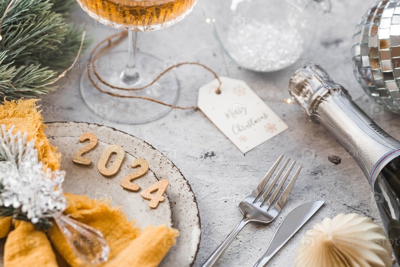 Сервировка стола. Стильные тарелки, салфетка, бокал, шампанское, елочные ветки и рождественские украшения на сером фоне. Концепция счастливого Рождества и Нового 2024 года