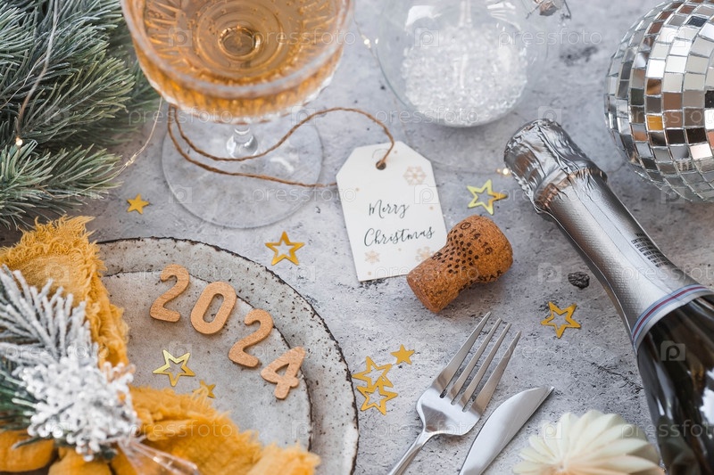Сервировка стола. Стильные тарелки, салфетка, бокал, шампанское, елочные ветки и рождественские украшения на сером фоне. Концепция счастливого Рождества и Нового 2024 года