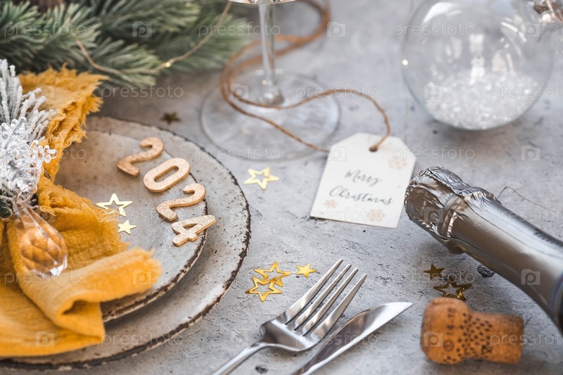Сервировка стола. Стильные тарелки, салфетка, бокал, шампанское, елочные ветки и рождественские украшения на сером фоне. Концепция счастливого Рождества и Нового 2024 года
