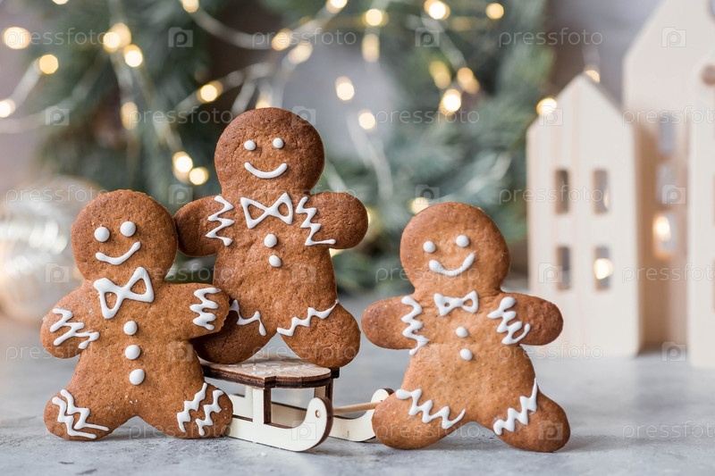 Рождественские пряники домашнего приготовления в сахарной пудре. Вкусные пряники на фоне боке елочных огней. Свежеиспеченные рождественские пряники