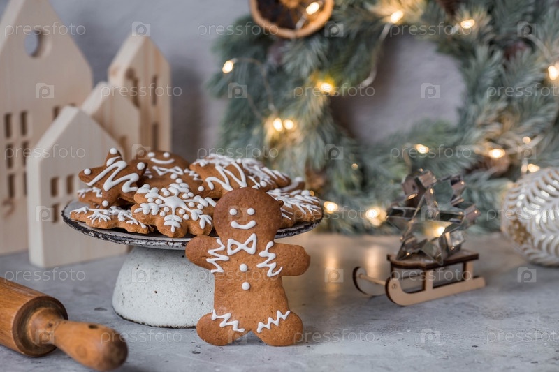 Рождественские пряники домашнего приготовления в сахарной пудре. Вкусные пряники на фоне боке елочных огней. Свежеиспеченные рождественские пряники