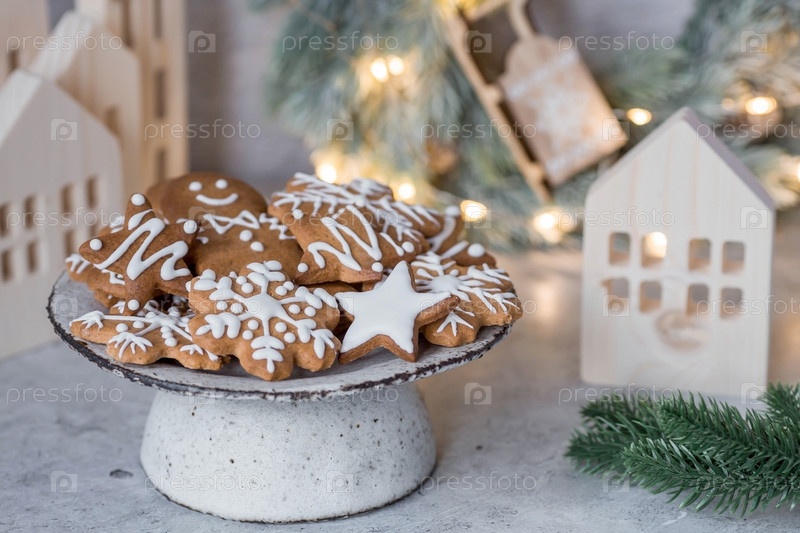 Рождественские пряники домашнего приготовления в сахарной пудре. Вкусные пряники на фоне боке елочных огней. Свежеиспеченные рождественские пряники