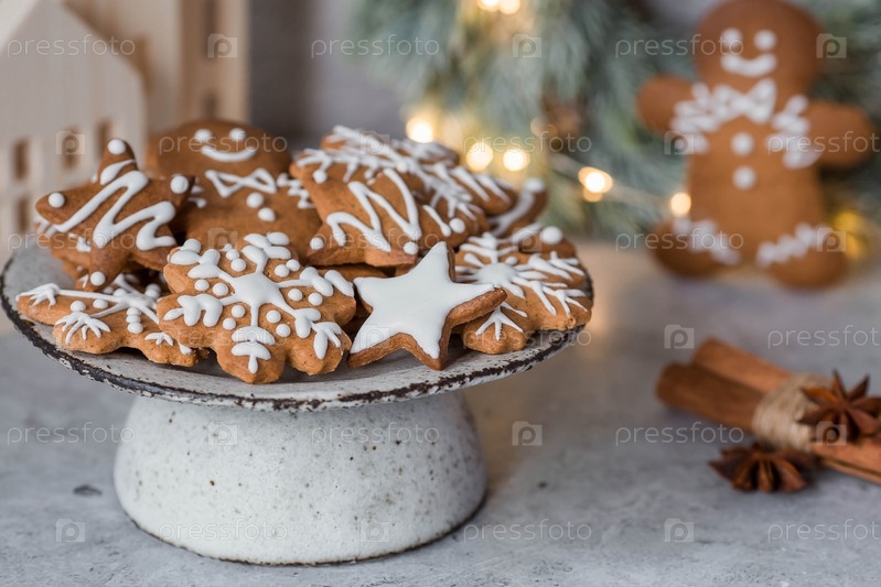 Рождественские пряники домашнего приготовления в сахарной пудре. Вкусные пряники на фоне боке елочных огней. Свежеиспеченные рождественские пряники