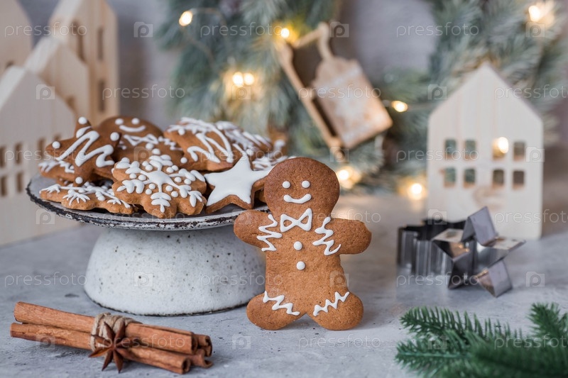 Рождественские пряники домашнего приготовления в сахарной пудре. Вкусные пряники на фоне боке елочных огней. Свежеиспеченные рождественские пряники