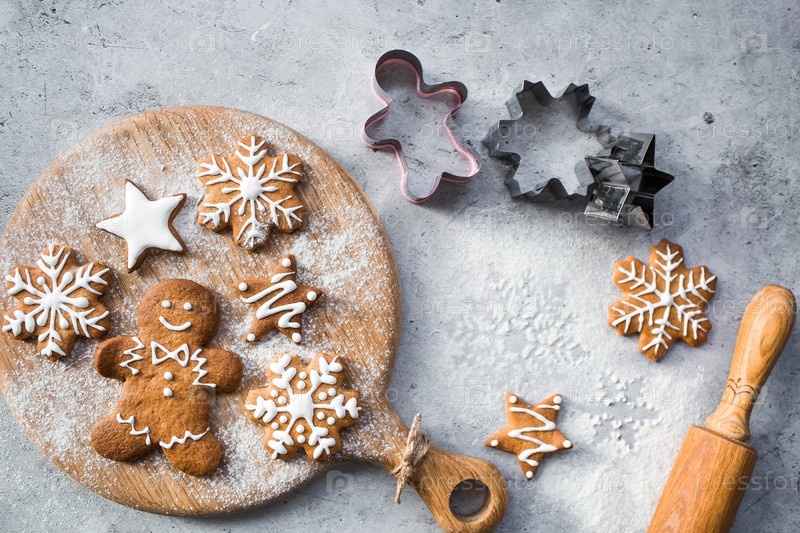 Рождественские пряники домашнего приготовления в сахарной пудре. Вкусные пряники на фоне боке елочных огней. Свежеиспеченные рождественские пряники