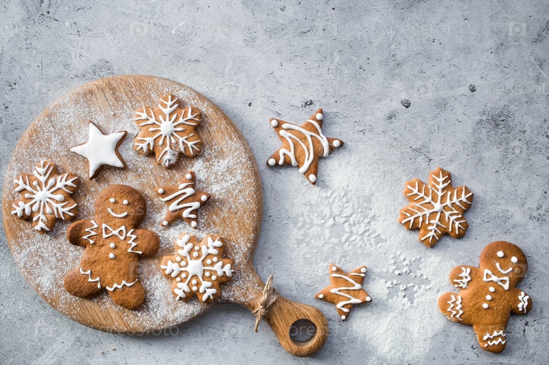 Рождественские пряники домашнего приготовления в сахарной пудре. Вкусные пряники на фоне боке елочных огней. Свежеиспеченные рождественские пряники