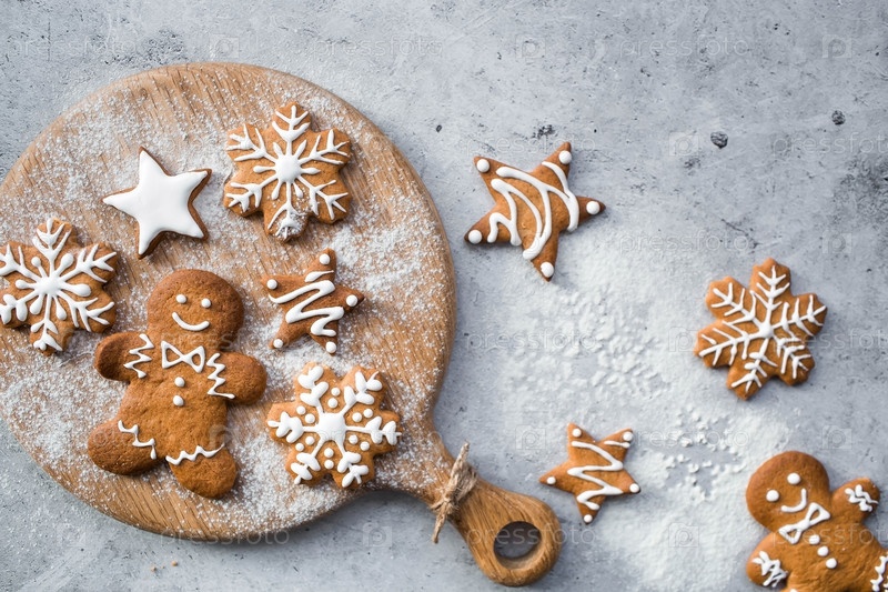 Рождественские пряники домашнего приготовления в сахарной пудре. Вкусные пряники на фоне боке елочных огней. Свежеиспеченные рождественские пряники