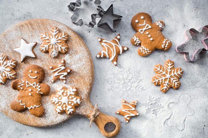 Рождественские пряники домашнего приготовления в сахарной пудре. Вкусные пряники на фоне боке елочных огней. Свежеиспеченные рождественские пряники