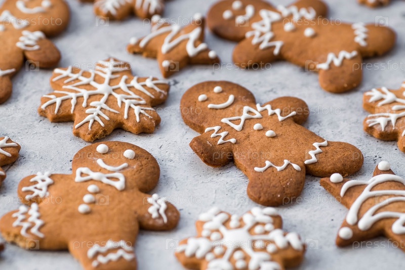 Рождественские пряники домашнего приготовления в сахарной пудре. Вкусные пряники на фоне боке елочных огней. Свежеиспеченные рождественские пряники
