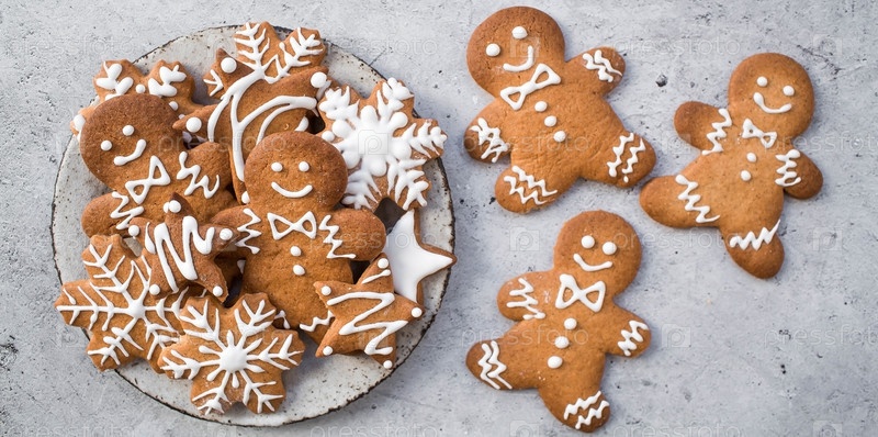 Рождественские пряники домашнего приготовления в сахарной пудре. Вкусные пряники на фоне боке елочных огней. Свежеиспеченные рождественские пряники