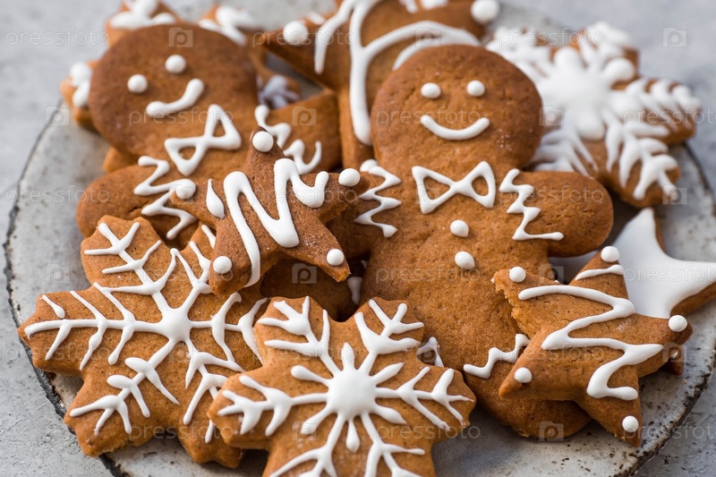 Рождественские пряники домашнего приготовления в сахарной пудре. Вкусные пряники на фоне боке елочных огней. Свежеиспеченные рождественские пряники