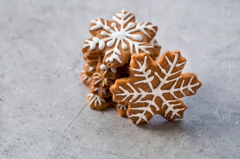 Рождественские пряники домашнего приготовления в сахарной пудре. Вкусные пряники на фоне боке елочных огней. Свежеиспеченные рождественские пряники