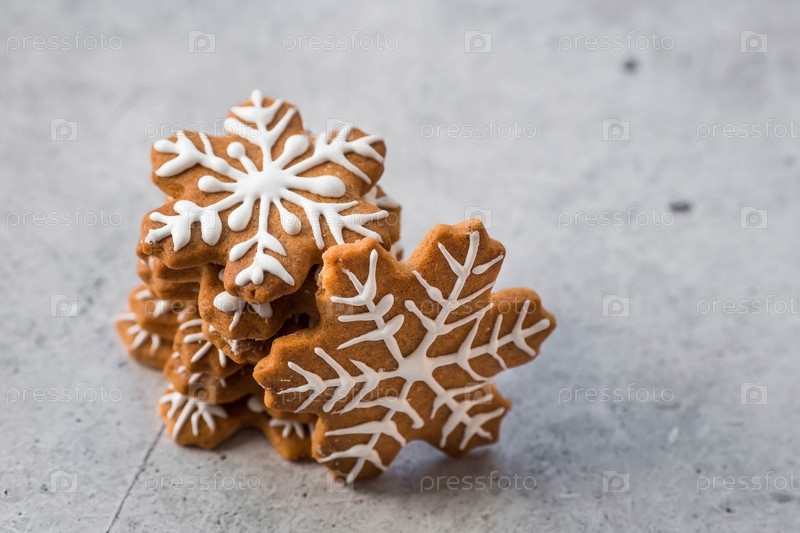 Рождественские пряники домашнего приготовления в сахарной пудре. Вкусные пряники на фоне боке елочных огней. Свежеиспеченные рождественские пряники