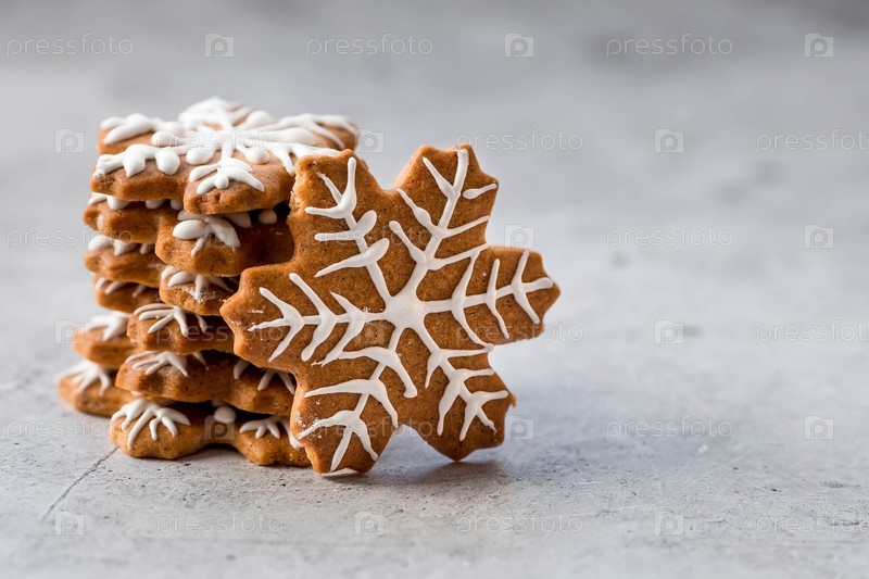 Рождественские пряники домашнего приготовления в сахарной пудре. Вкусные пряники на фоне боке елочных огней. Свежеиспеченные рождественские пряники