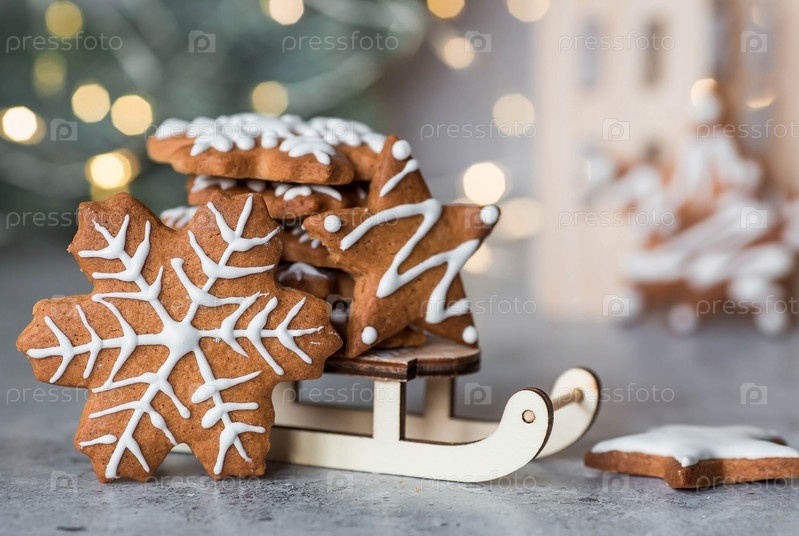 Рождественские пряники домашнего приготовления в сахарной пудре. Вкусные пряники на фоне боке елочных огней. Свежеиспеченные рождественские пряники