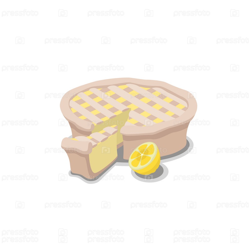 Пирог с маленьким куском рядом и лимоном с тенью на белом фоне