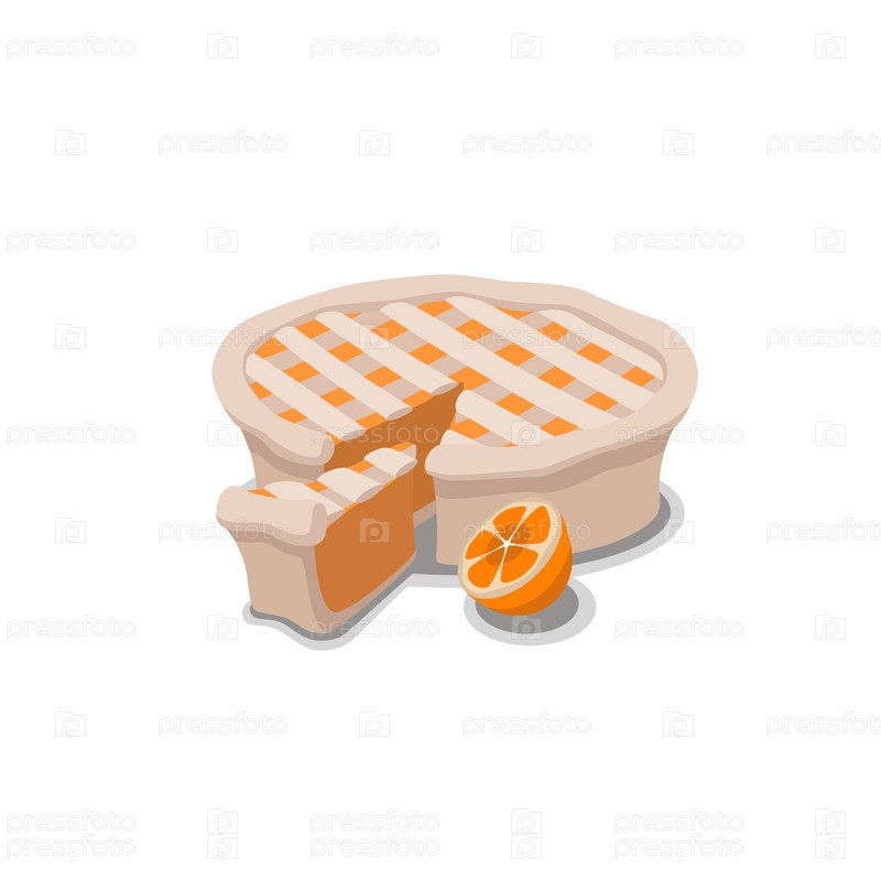 Пирог с маленьким куском рядом и апельсином с тенью на белом фоне