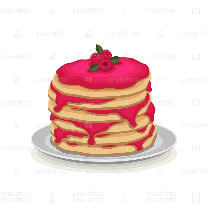 Блинчики с малиновым вареньем на тарелке на белом фоне