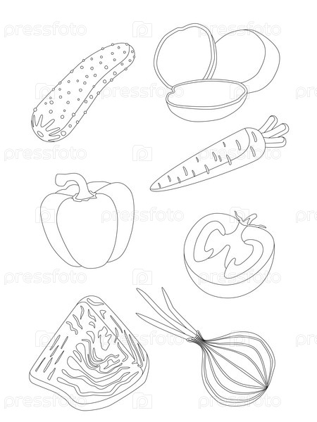 Раскраска для детей с набором овощей - картофель, капуста, помидор, огурец, луковый луг, перец, морковь - линии на белом фоне