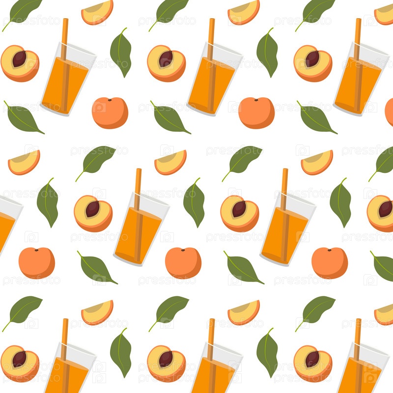 Узор с персиками, ломтиками, персиковым соком в стакане, тремя листьями на белом фоне