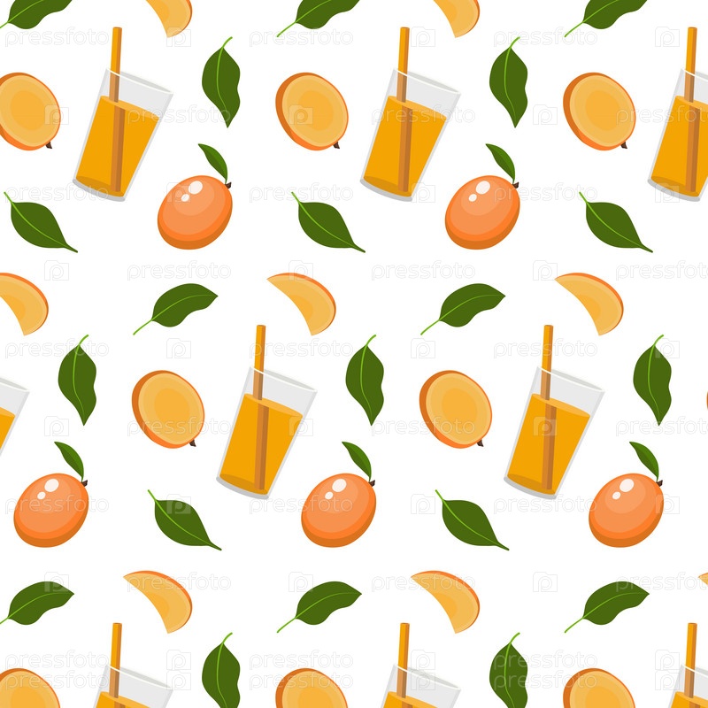 Узор с ломтиками манго, сок манго в стакане, три листа на белом фоне