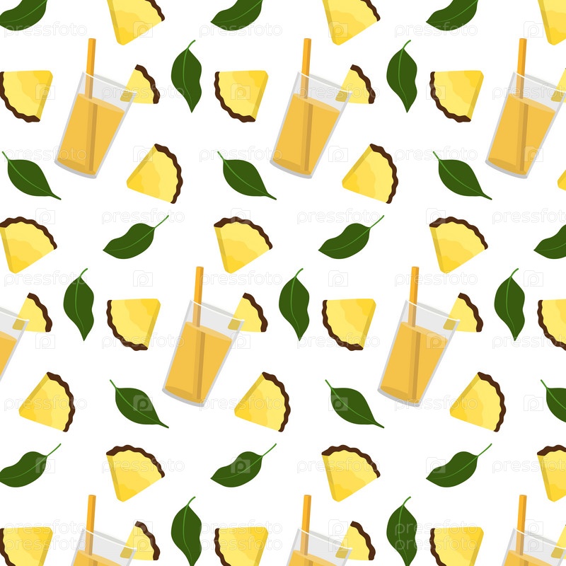 Узор с ананасом, ломтиками, ананасовым соком в стакане, тремя листьями на белом фоне