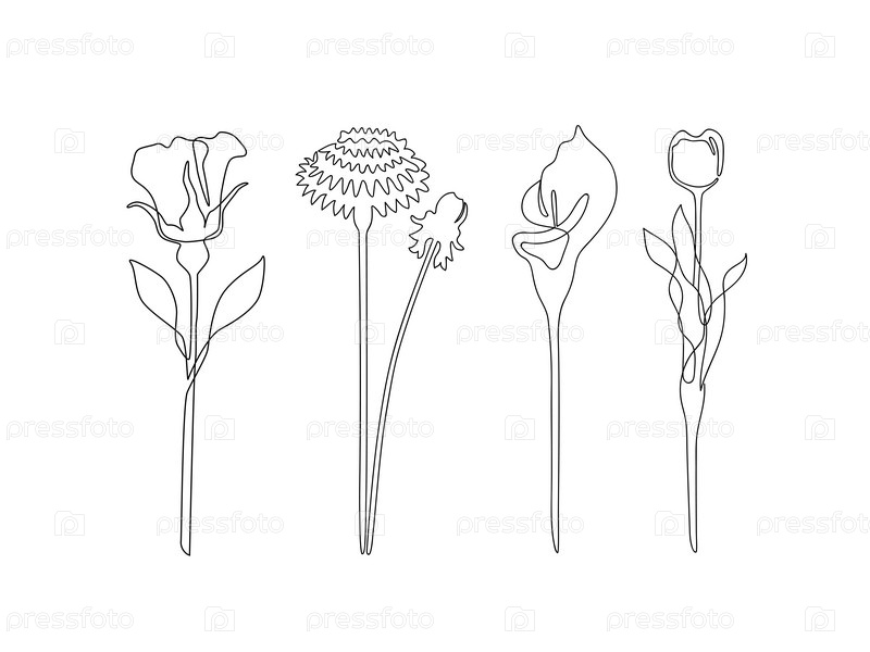 Линейные цветы роза, одуванчик, калла, тюльпан, белый фон