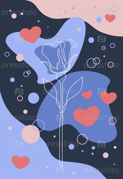 Плакат с контуром цветка розы на абстрактном фоне, кругами, сердцами