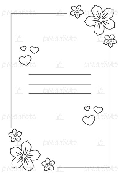 Прямоугольная раскраска с местом для текста с контурными цветами по углам, сердечками внутри, белым фоном