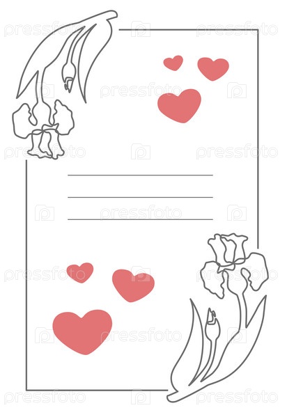 Прямоугольная открытка с местом для текста с контурными ирисами на белом фоне