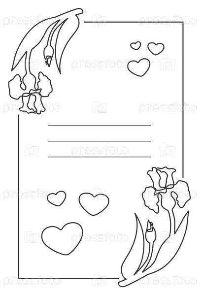 Прямоугольная раскраска с местом для текста с контурными ирисами в углах, сердечками внутри, белым фоном