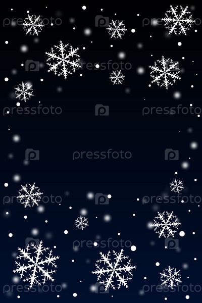 Фон прямоугольный вертикальный со свободным пространством для текста, падающим белым снегом, снежинками в небе с темно-синим переходом