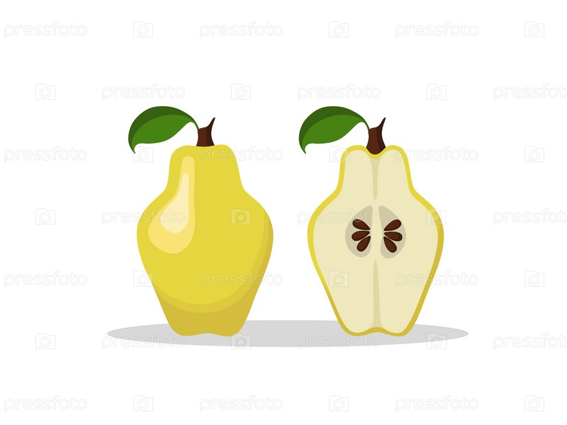 Целая и разрезанная пополам желтая айва с листом с тенью на белом фоне