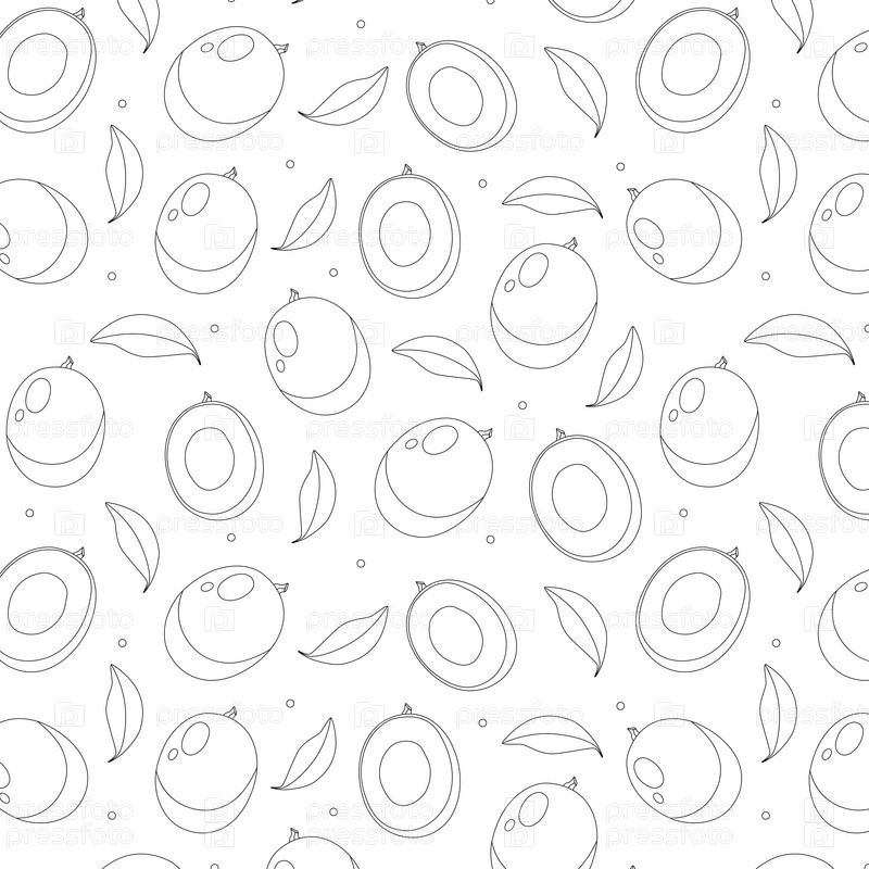 Бесшовный рисунок раскраски с целым манго, разрезанным пополам, листьями, разными кругами на белом фоне