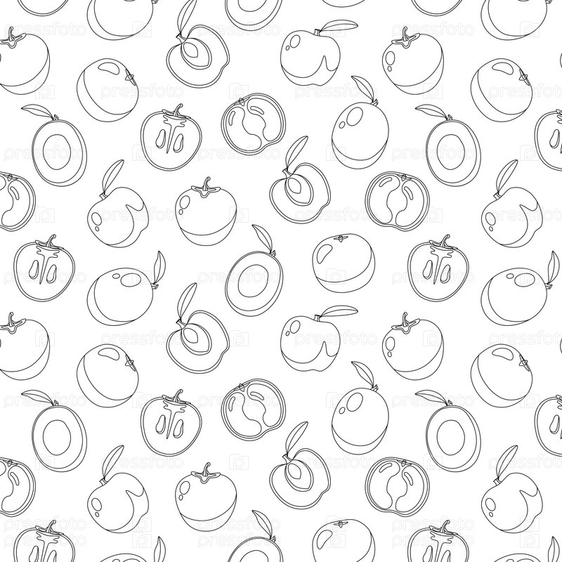 Бесшовный рисунок окраски с апельсинами, абрикосами, манго, хурмами целиком, разрезанными пополам, цветами, различными кругами на белом фоне