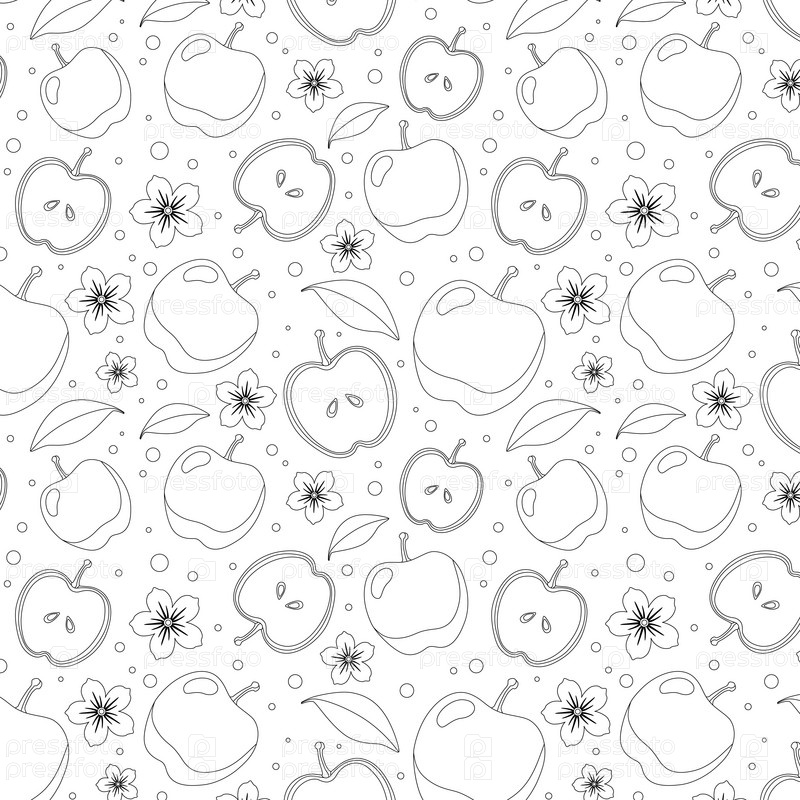 Бесшовный рисунок раскраски с целыми яблоками, разрезанными пополам, цветами, листьями, разными кругами на белом фоне