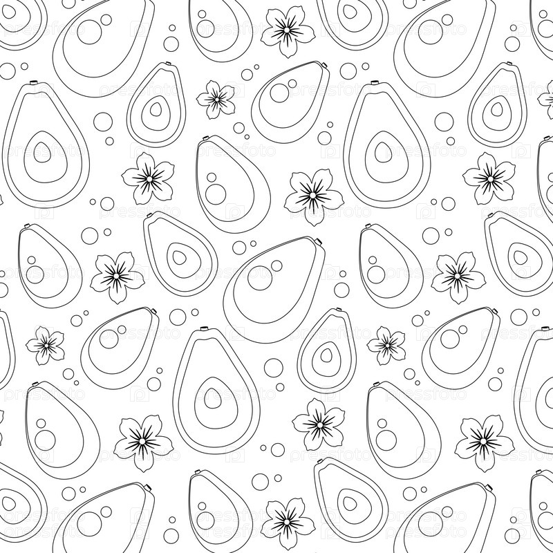 Бесшовный рисунок раскраски с целыми авокадо, разрезанными пополам, цветами, разными кругами на белом фоне