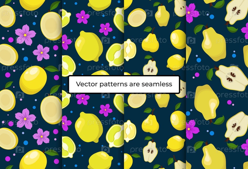 Набор бесшовных узоров с грушами, лимонами, манго, айвой, розовыми цветами, листьями, кругами на темно-синем фоне