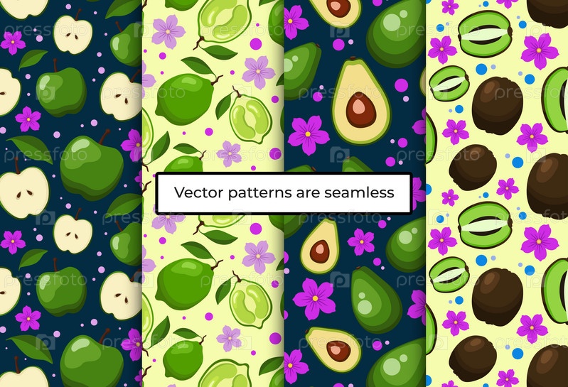 Набор бесшовных узоров с фруктами, яблоками, авокадо, лаймом, киви, розовыми цветами, листьями, кругами на синем и светлом фоне