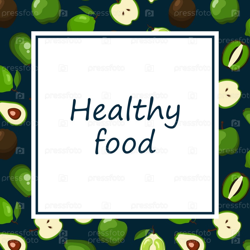 Квадратный пост, плакат с надписью "Здоровое питание" с рамкой, зеленые фрукты в центре белого фона