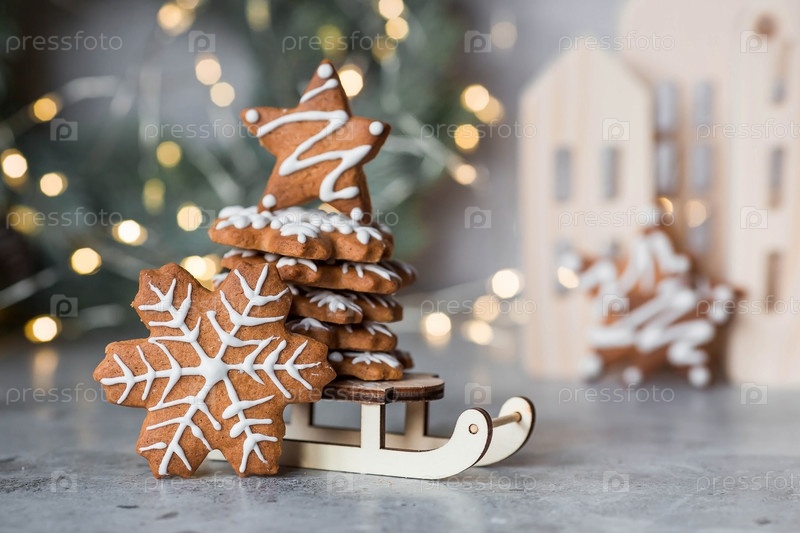 Рождественские пряники домашнего приготовления в сахарной пудре. Вкусные пряники на фоне боке елочных огней. Свежеиспеченные рождественские пряники