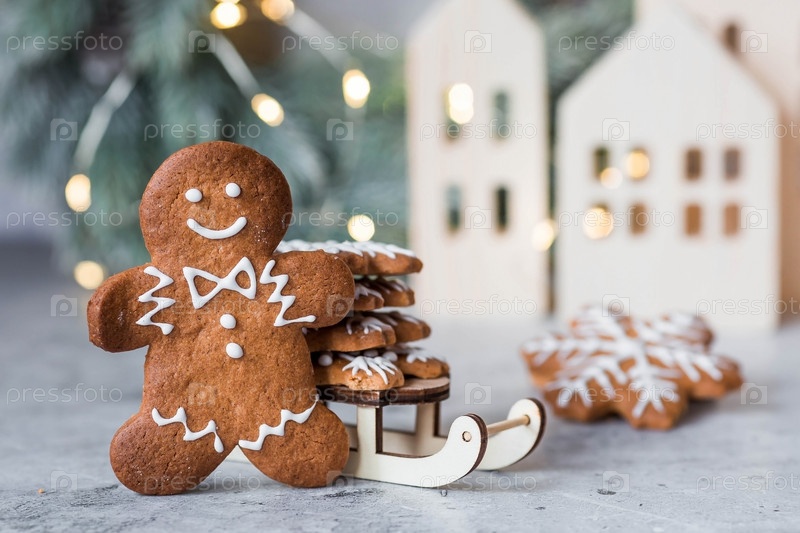 Рождественские пряники домашнего приготовления в сахарной пудре. Вкусные пряники на фоне боке елочных огней. Свежеиспеченные рождественские пряники