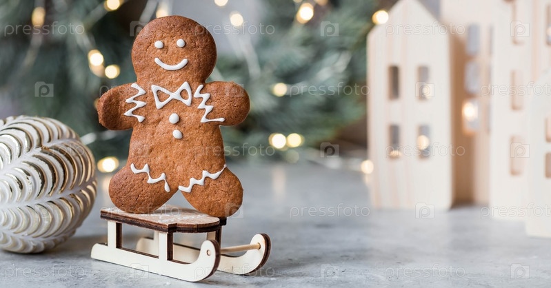 Рождественские пряники домашнего приготовления в сахарной пудре. Вкусные пряники на фоне боке елочных огней. Свежеиспеченные рождественские пряники