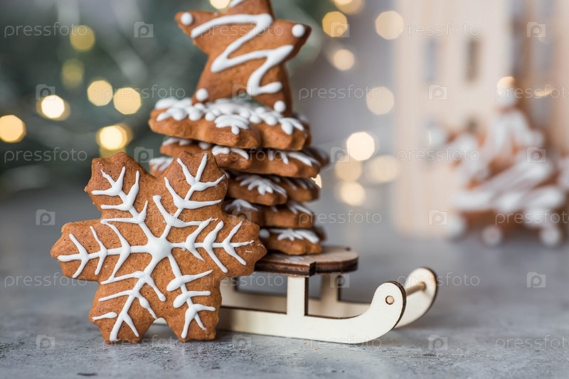 Рождественские пряники домашнего приготовления в сахарной пудре. Вкусные пряники на фоне боке елочных огней. Свежеиспеченные рождественские пряники