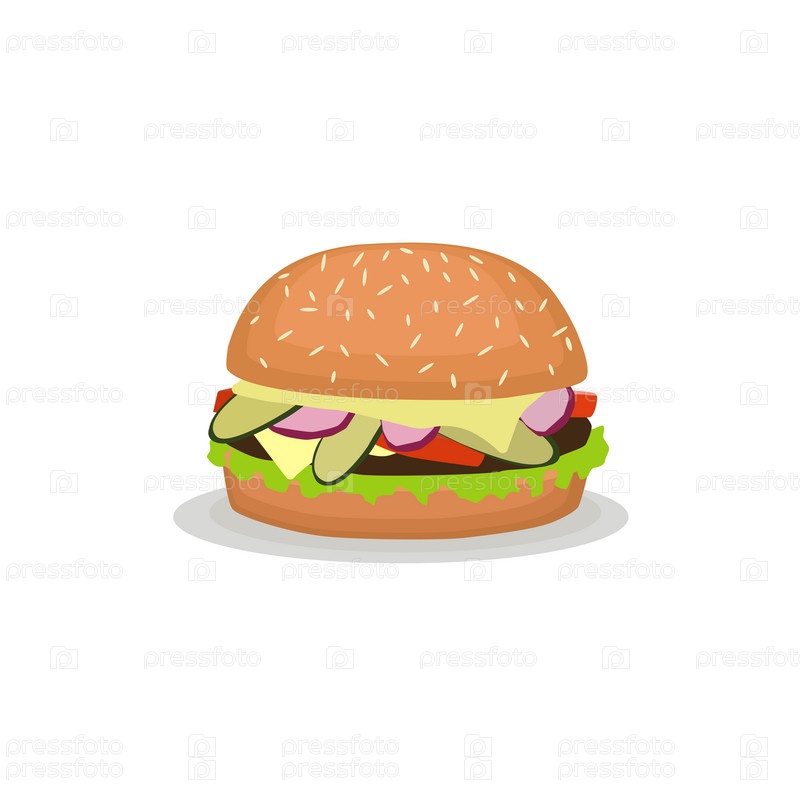 Бургер с котлетой, огурцами, сыром, помидорами на белом фоне