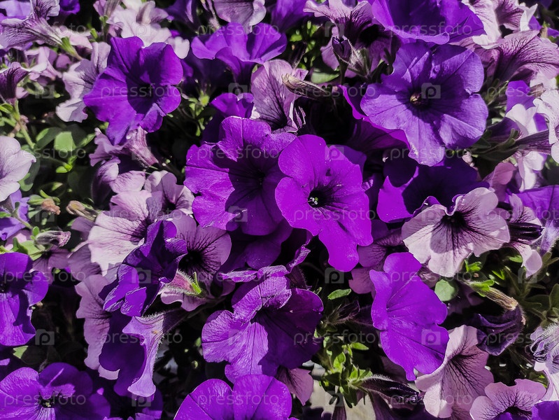 Множество красивых фиолетово-розовых петуний растут вместе в разных направлениях